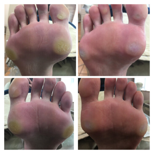お話を伺うと、お仕事でどうしてもヒールのある靴を履かなければならず長年の圧迫と摩擦によって、両足の裏に驚くほど大きく硬い「タコ」ができてしまっていました。